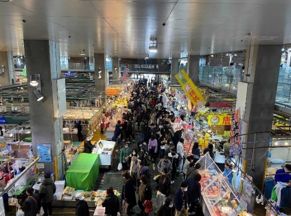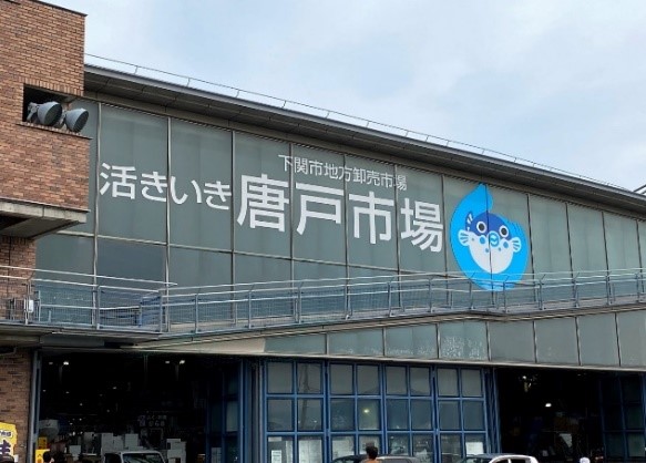 接下來,我們來到了唐戶市場。 除了有在關門海峽捕撈的魚外,也有從其他縣來的豐富魚種。 它不僅批發魚,還販賣壽司和油炸食品,使其成為年輕人和外國遊客的熱門景點。 特別是在週五、週六、週日和節日,舉辦名為「充滿活力的馬關街」的餐飲活動,現場人聲鼎沸。 (馬關是下關的另一個名稱。)