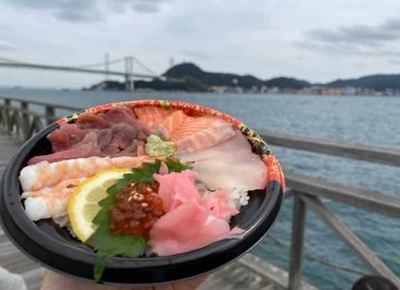 海鮮蓋飯是在醋飯上放上魚和貝類生魚片的料理。 推薦給那些說想一次吃多種海鮮!的人。