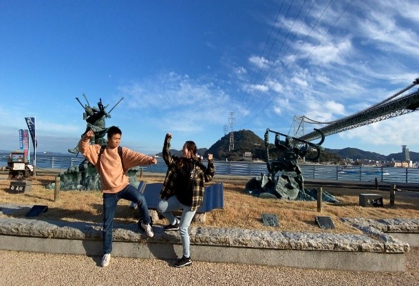 模仿雕像的動作拍了一張紀念照片,不如嘗試一下像這張照片一樣以關門海峽為背景拍照吧!
