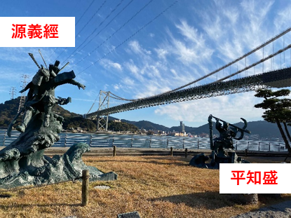 這是「壇之浦之戰」發生的地方。公園內有源義經《八艘飛》和平知盛《碇潛》樣子的雕像。他們是這場戰鬥的兩個主要參與者。「八艘飛」指的是義經從一艘船跳到另一艘船,在海上敏捷跳躍移動的樣子。 「碇潛」指的是平知盛身上掛著錨入水的景象。