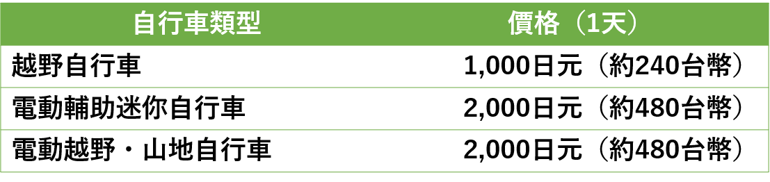 這次租的自行車是越野車和電動越野車。自行車鎖和安全帽可以免費借用。