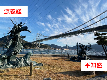 ここは「壇ノ浦の戦い」が行われた場所です。公園内には、源義経の「八艘飛び(はっそうとび)」と平知盛の「碇潜(いかりかづき」の様子を表現した銅像が設置されています。彼らはこの戦いにおいての主要な2人です。「八艘飛び」とは義経が船から船へと海上を身軽に飛び移る様子のことを指します。また「碇潜」とは平知盛が碇を身体に担いで入水する光景のことを言います。