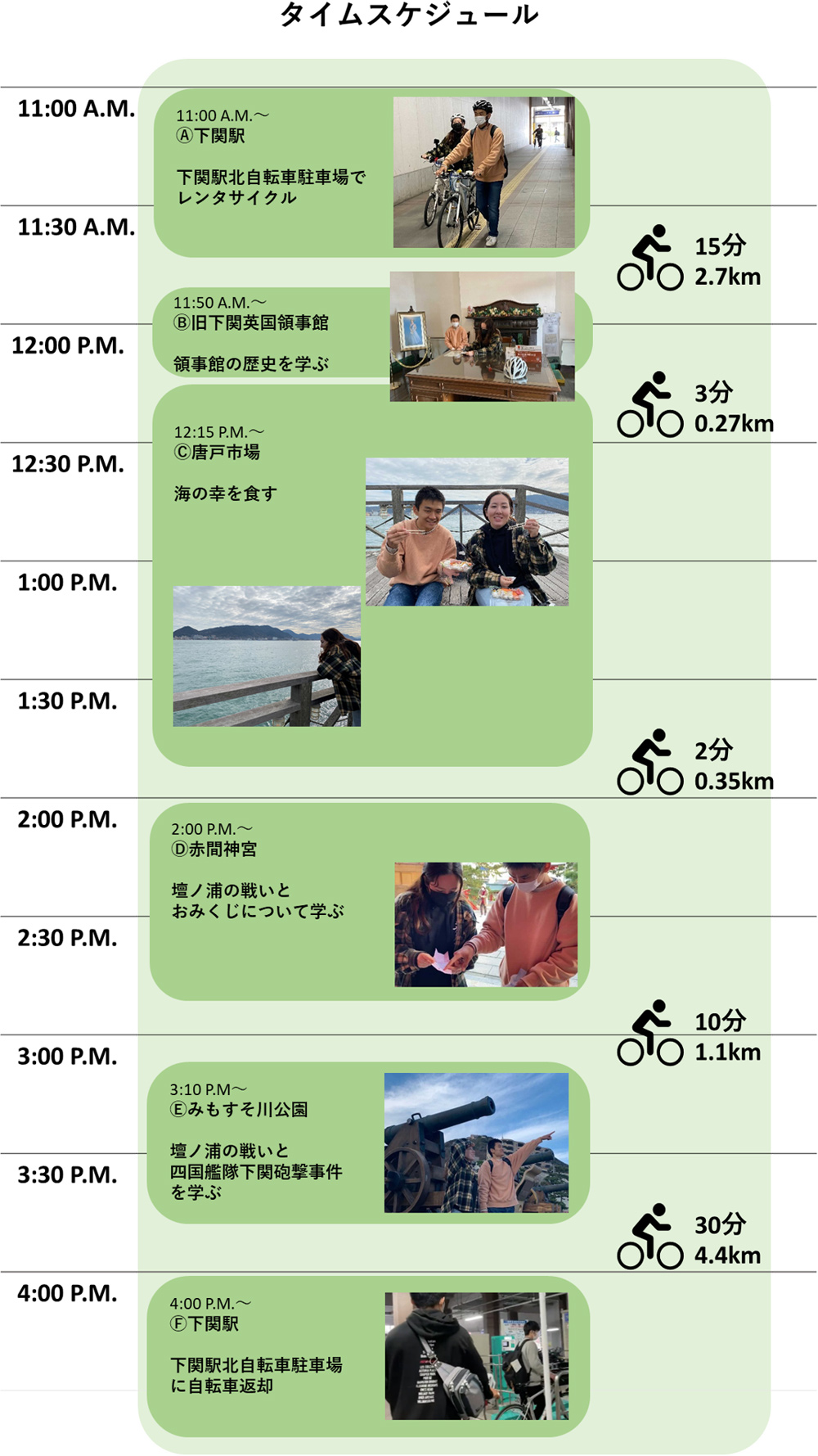 今回のサイクリングコースの魅力は、1日で下関市街地にある多くの有名観光地を回れることです。下関市は交通量が多いので自転車での移動がぴったりです。