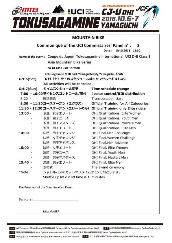 本日の「やまぐち十種ヶ峰国際ダウンヒル」は、別添のスケジュールで開催します。