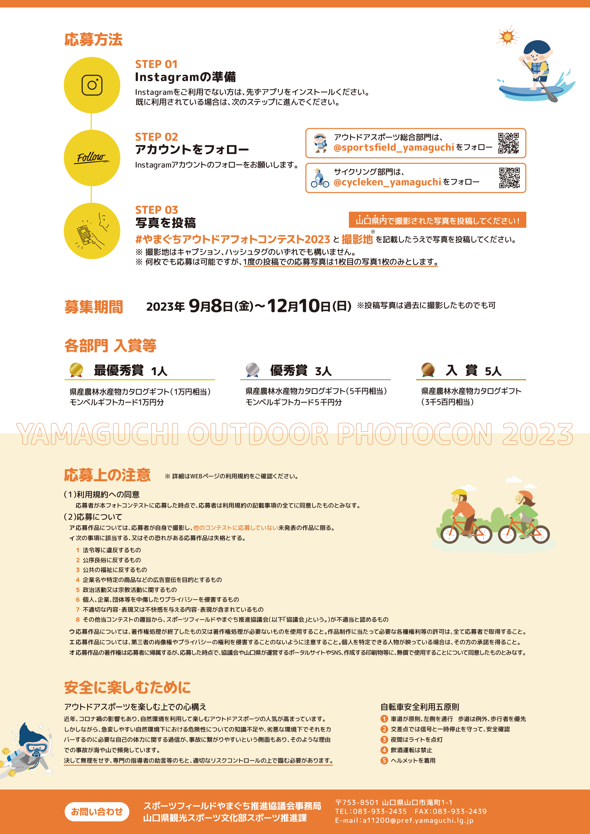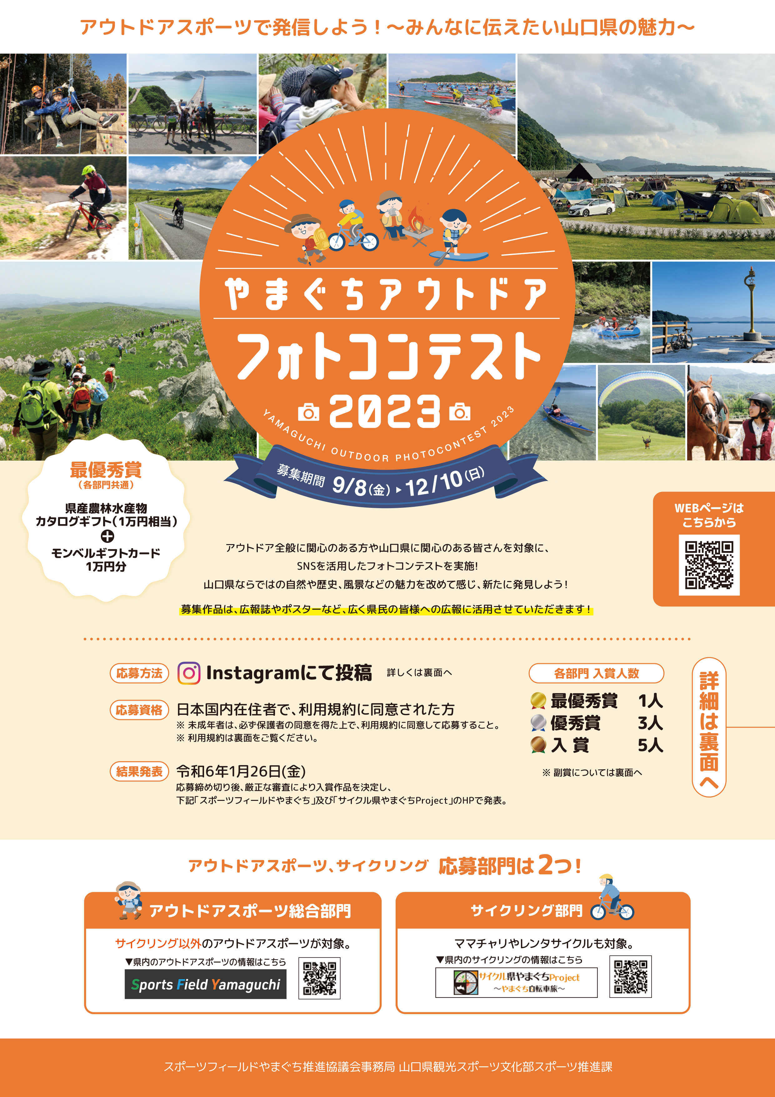 サイクリング部門とアウトドアスポーツ総合部門(サイクリング以外のアウトドア)の2部門での募集となっており、それぞれインスタで下記のアカウントをフォローして、「#やまぐちアウトドアフォトコンテスト2023」と撮影地を記載した上で写真を投稿するだけで募集ができる、とにかく参加しやすさを追求したキャンペーンになっています!