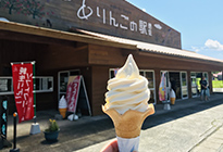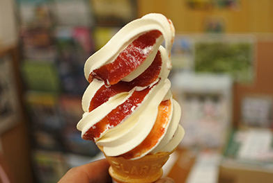 地元産のトマトをたっぷり使ったジャムがかかった、道の駅の名物ソフトクリーム。トマトの酸味とアイスの甘みが絶妙にマッチングしている。