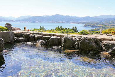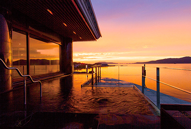 眼下に深川湾と青海島が広がる向津具半島の高台にある温泉。露天風呂からの眺望は絶景で、シーズン中の夜には漁火などを眺めながらゆったりとくつろげる。