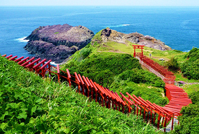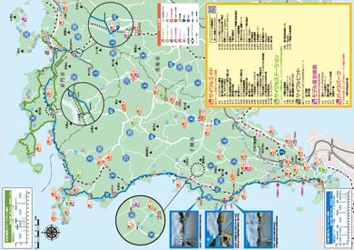 急坂が続く厳しいコースですが、絶景スポットとして人気の元乃隅神社、東後畑棚田、千畳敷を巡るコースです。コース途中で訪れる長門市の中心部仙崎地区は童謡詩人金子みすゞの出身地として知られるほか、道の駅センザキッチンでは、地元の海の幸・山の幸が堪能できます。