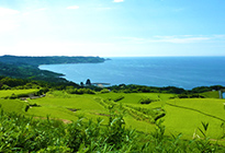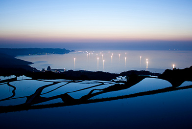 5月中旬~6月上旬の水張り時期の夕暮れ時になると、深青色の日本海と水田に夕日が沈む美しい光景が広がる。