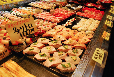 毎週金~日曜日と祝日には市場が海鮮屋台街に大変身する「活きいき馬関街」が開催され、握り寿司や唐揚げ、ふく刺しなど、新鮮な海の幸を堪能できる。